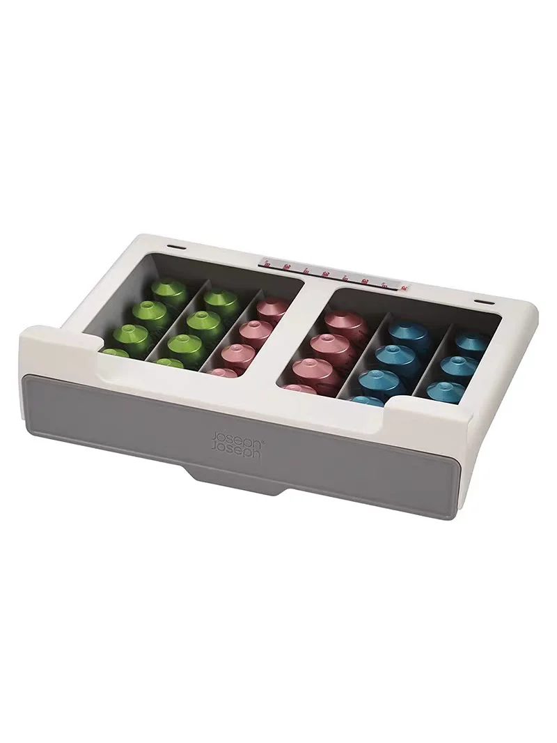 Ce rangement allie robustesse et légèreté visuelle. La structure en métal résiste à l'usage quotidien tout en restant suffisamment discrète pour s'intégrer à n'importe quel environnement. Les 6 rangées de 5 emplacements maintiennent fermement chaque capsule, éliminant tout risque de chute même lors d'une ouverture énergique de placard.