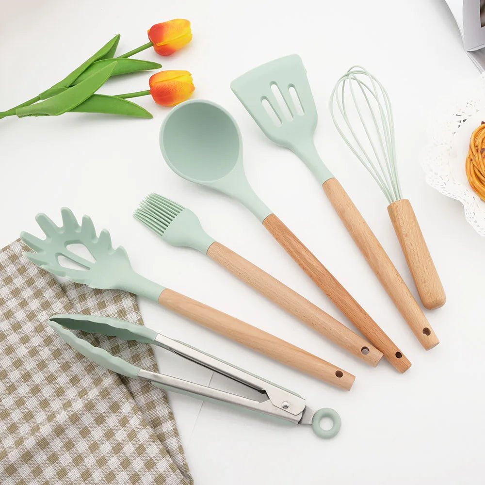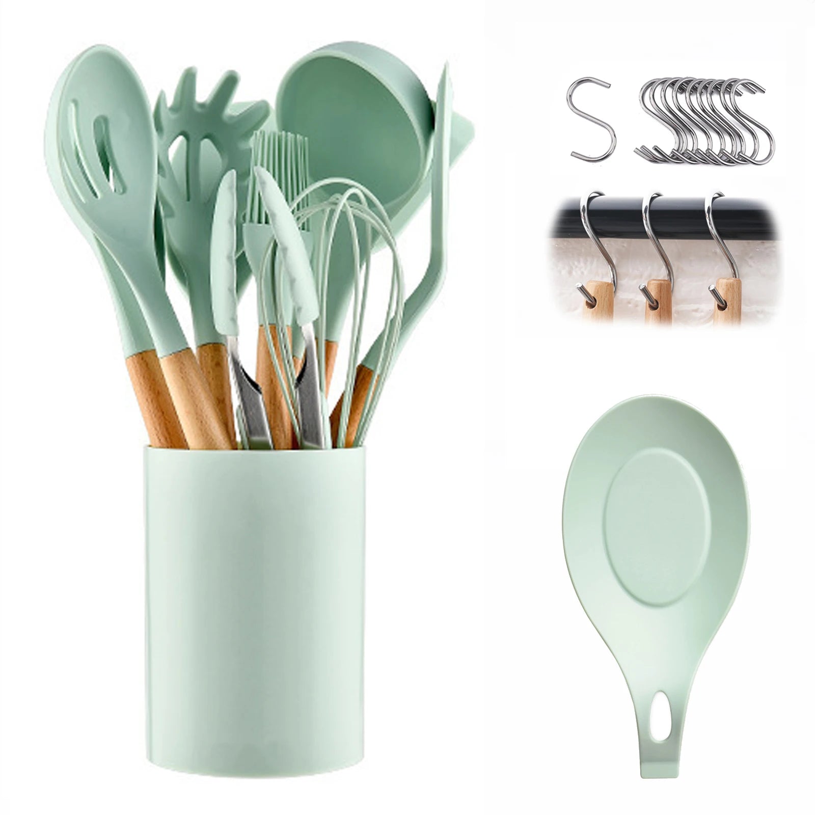 Set d'Ustensiles de Cuisine Vert Sauge â 13 piĂšces avec Pot et Crochets